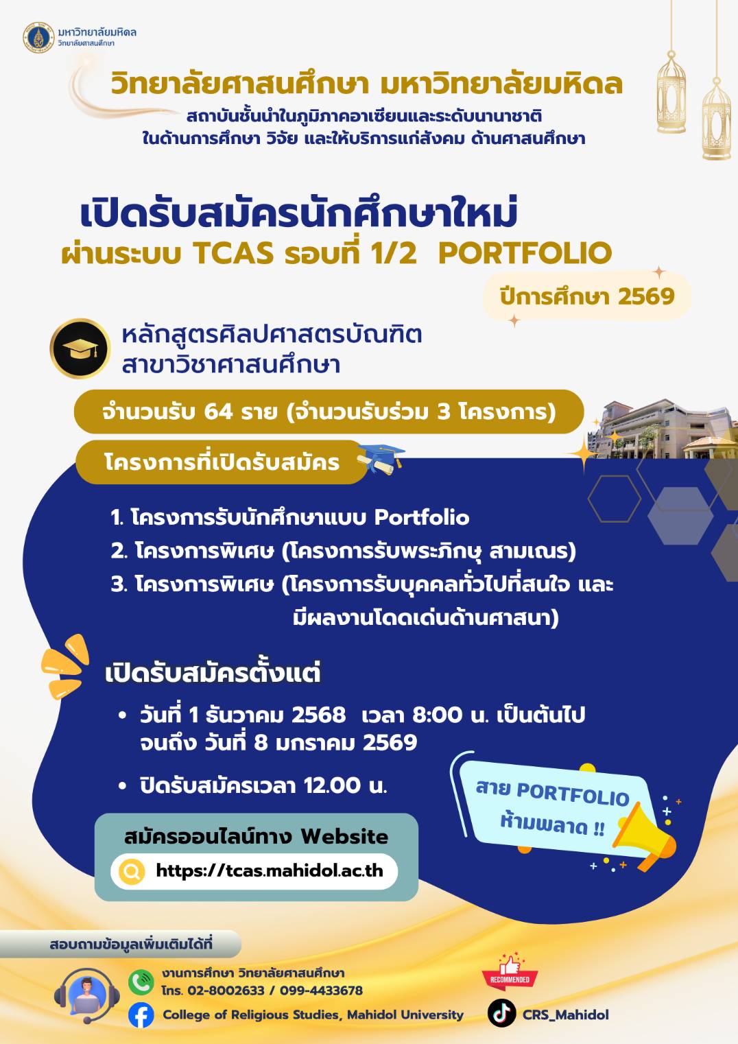 รอบที่ 1/1 Portfolio (แฟ้มสะสมผลงาน) จำนวนรับสมัคร 110 คน (จำนวนรับร่วม 3 โครงการ)