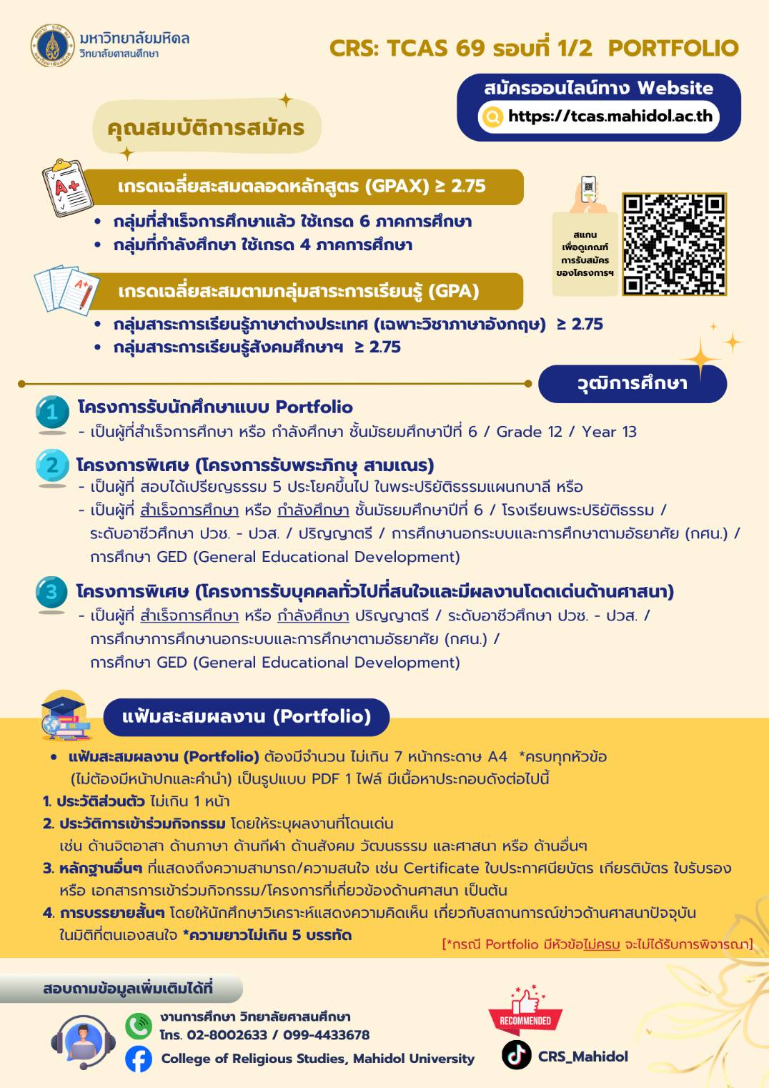 เกณฑ์การรับสมัครนักศึกษาผ่านระบบ TCAS ประจำปีการศึกษา 2569